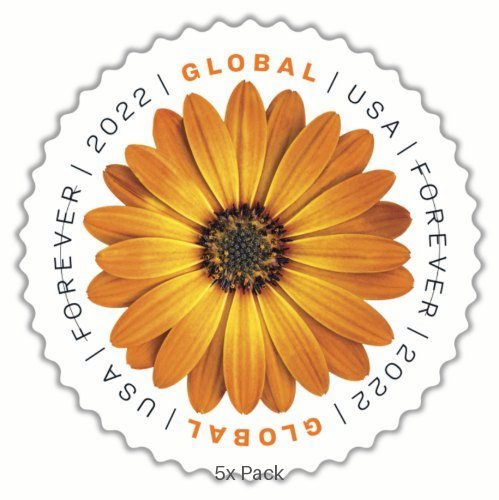 Design Purpose: Issued on March 14, 2022, this stamp features a vibrant orange African Daisy (Osteospermum) photographed from above, showcasing its intricate central disk and radiant petals. The round shape symbolizes global unity and the beauty of nature shared across borders. It’s the 9th issue in the Global Forever series, celebrating international connection through floral elegance.